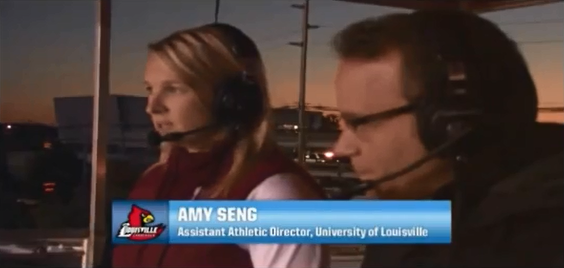 Producing a game at Louisville this past Fall. Assistant Athletic Director Amy Seng is filmed on camera during an in game interview during Louisville vs. UCONN.